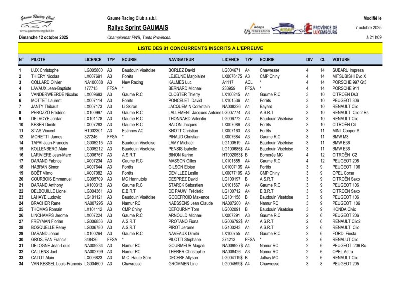 La liste s'étoffe pour le Rallye sprint Gaumais 2025 mais il reste encore de la place. Ne tardez plus à vous inscrire !