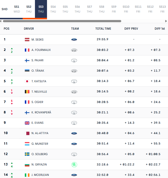 Après la SS3, le leader… c’est Mārtiņš Sesks, au volant de la Ford Puma Rally1, qui signe un début de rallye aussi inattendu que spectaculaire.
